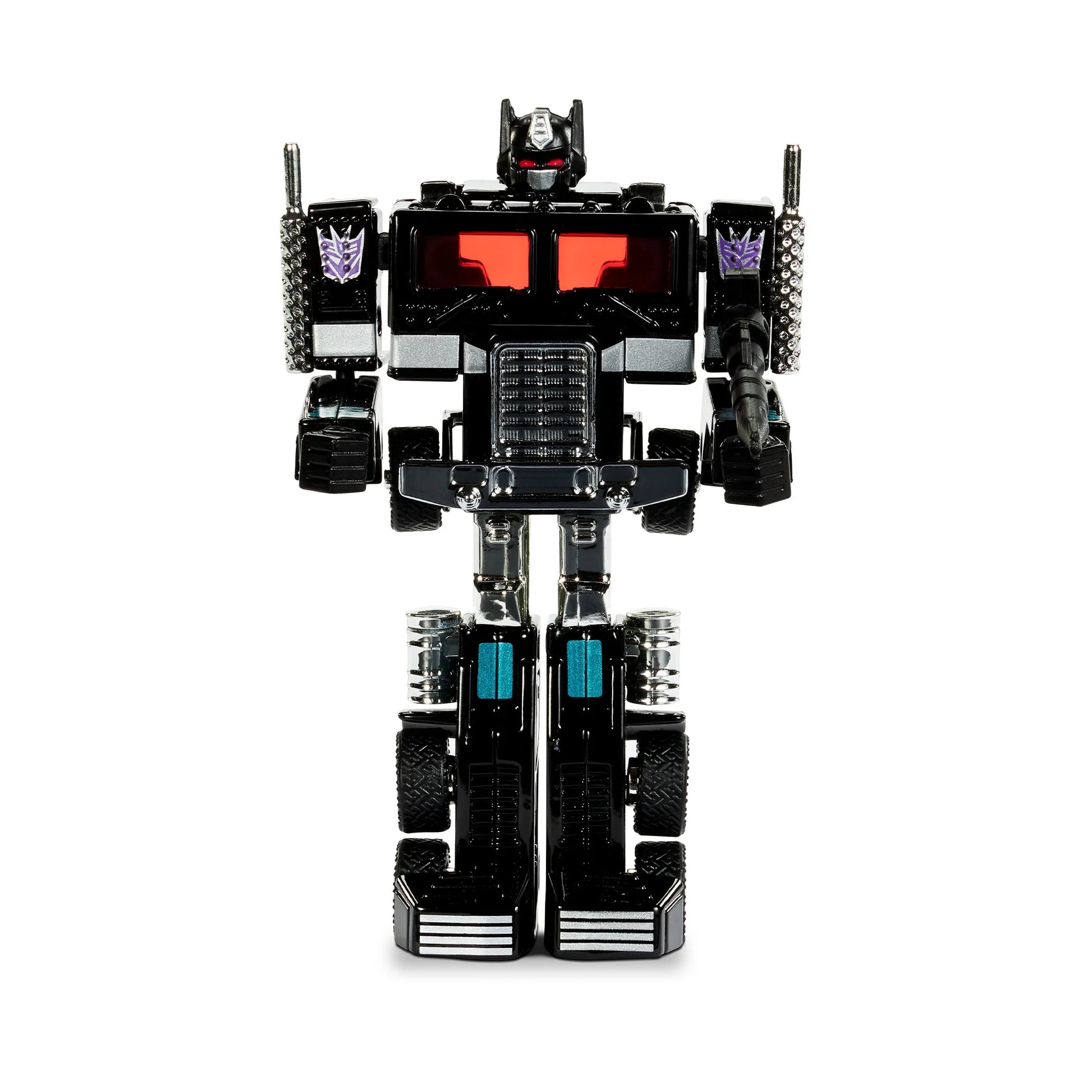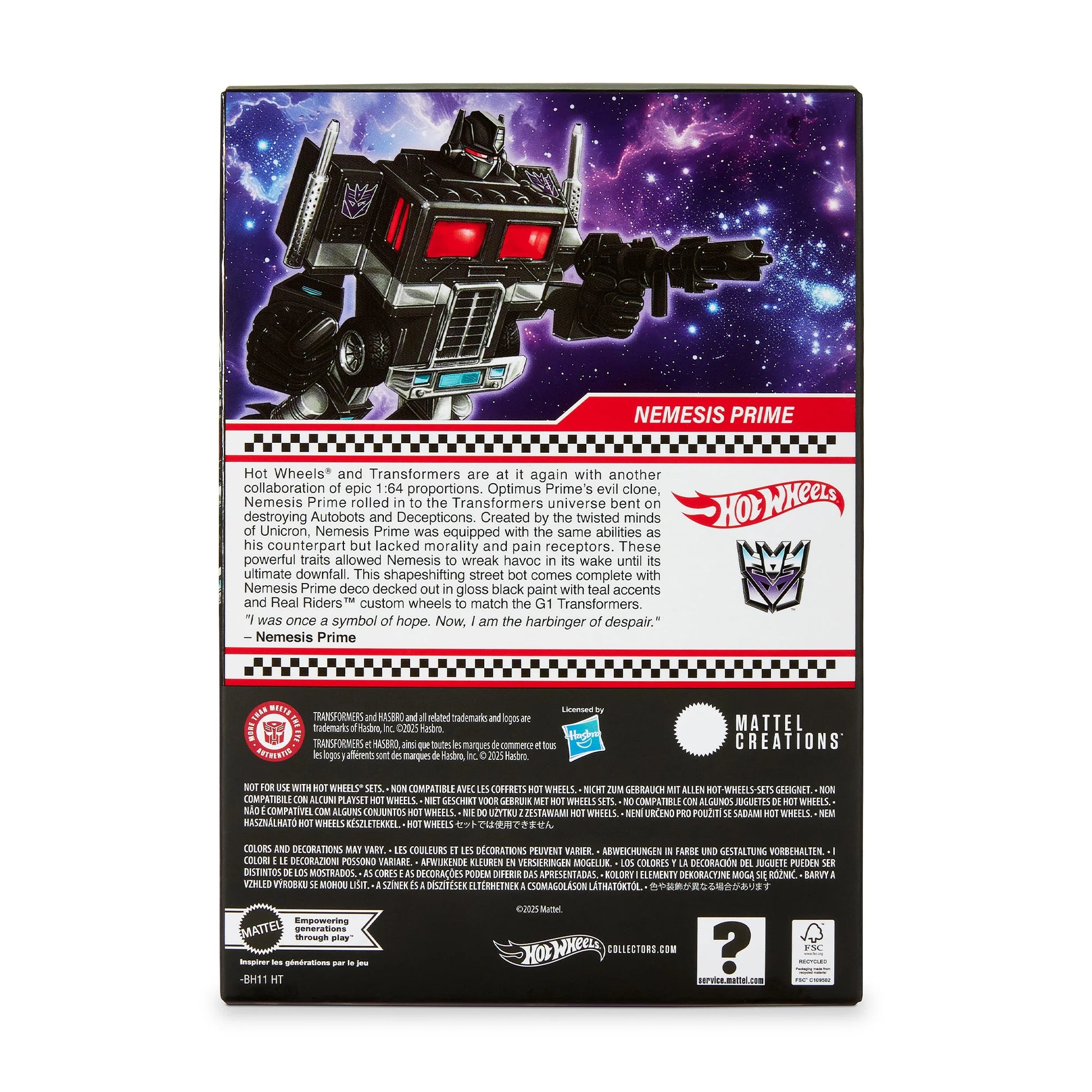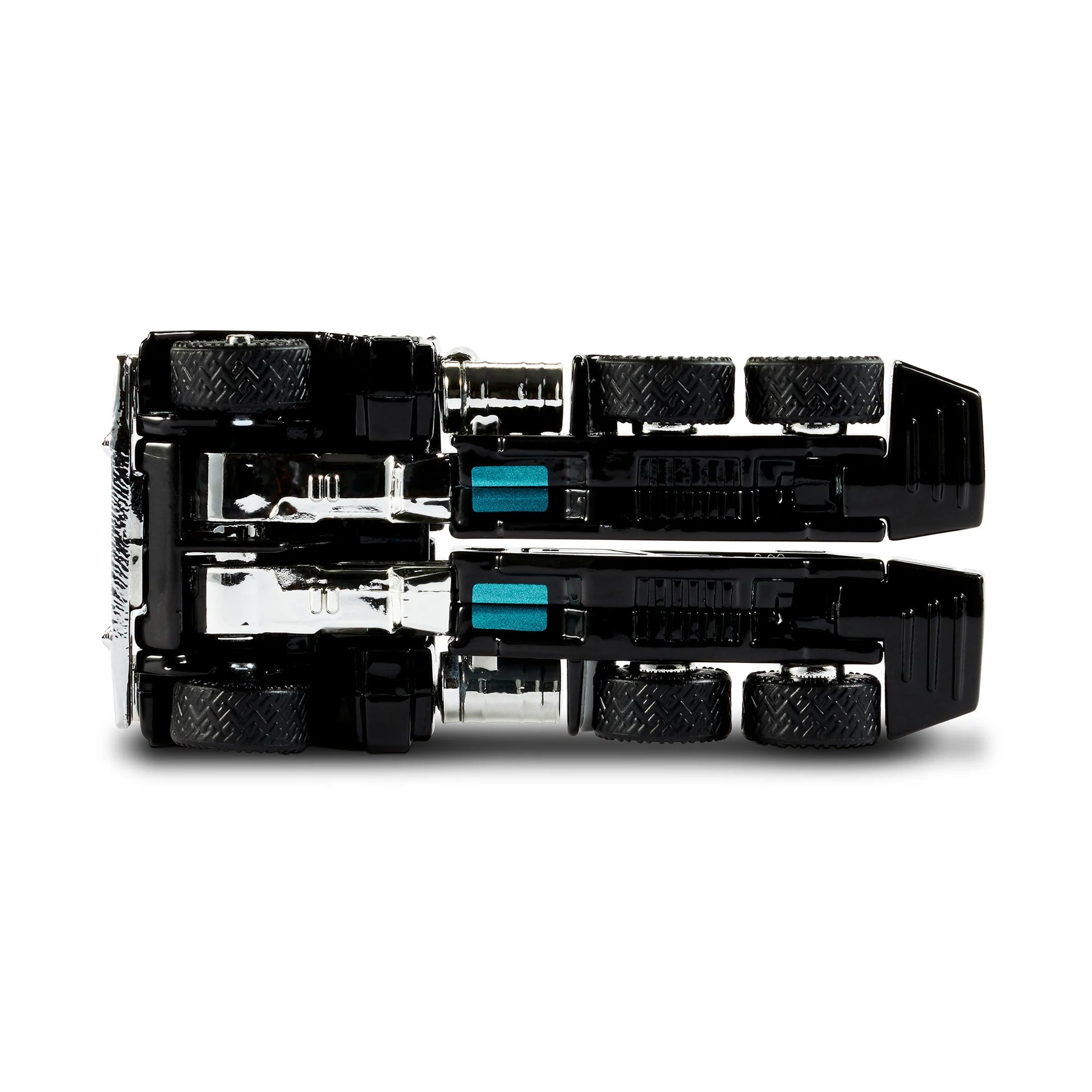 🏁 Two powerhouse franchises collide in the Hot Wheels Transformers Nemesis Prime, a premium 1:64 diecast that fully transforms from a heavy-duty semi truck into the fearsome Decepticon warrior. This is Optimus Prime’s ruthless evil clone, finished in gloss black with teal accents and translucent red windows for a true villain’s presence.
