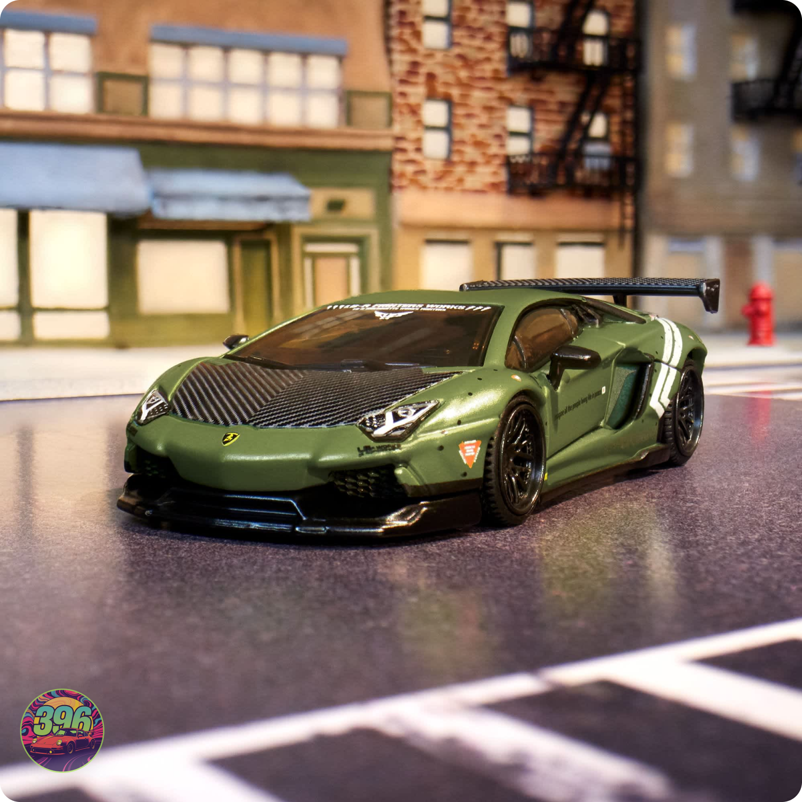 - Wide-body perfection in 1:64 — menacing metallic green with full LB★Performance livery, exposed carbon fibre bonnet, massive GT rear wing, deep black multi-spoke Real Riders wheels, and that unmistakable Liberty Walk aggressive aero kit that makes every other Aventador look stock.